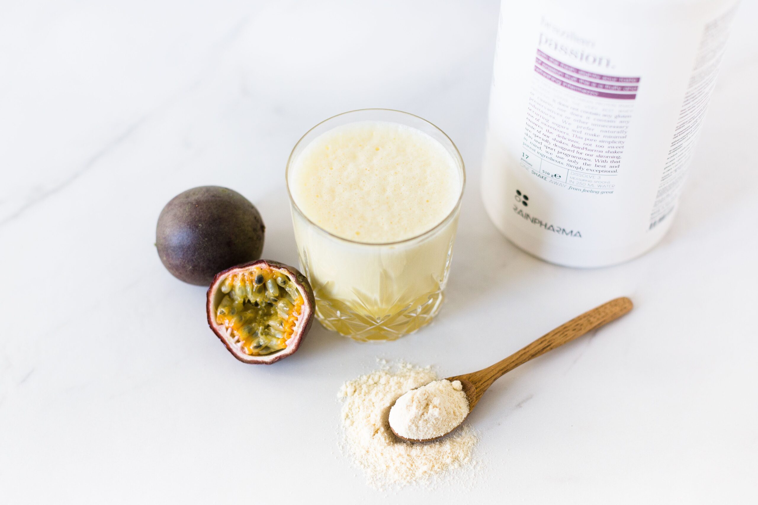 Het betreft een poedertussendoortje voor het maken van een drank met de smaak van passievrucht, gezoet met zoetstof en natuurlijke suikers, rijk aan eiwitten, met een energiewaarde van 112 kcal per portie.